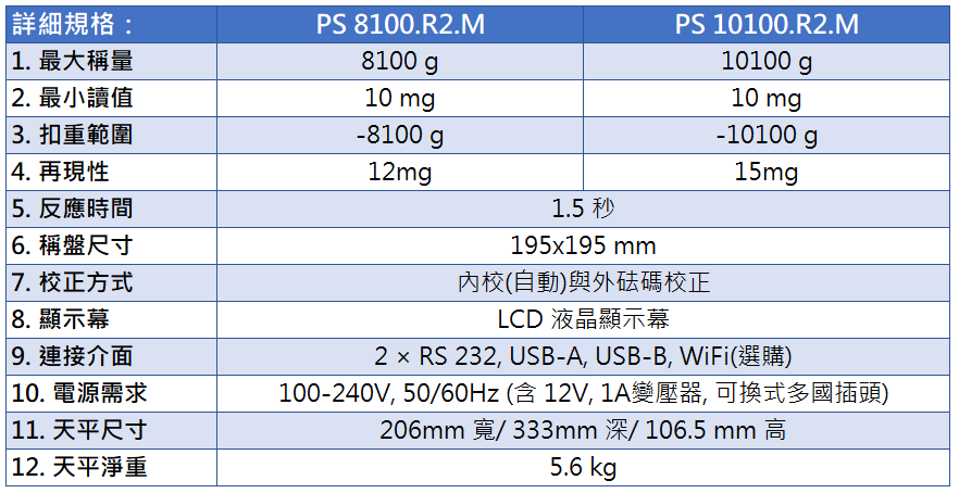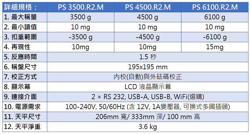 小數下二位天平(0.01g),PS.R2.M全系列具備內校砝碼。提供3500g~10100g秤量範圍需求,滿足各行各業的使用條件。