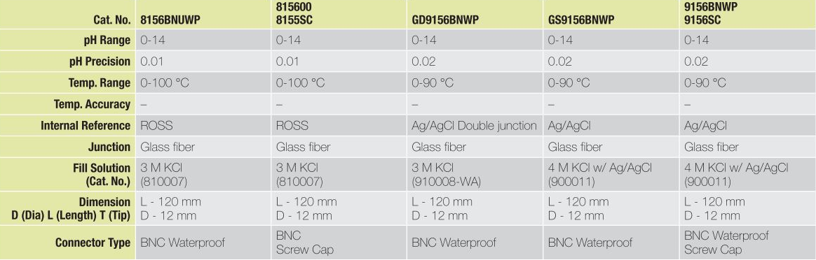 Thermo Scientific Orion 電極系列大致可分為pH、ORP及ATC溫度電極,pH系列又可分為長效型(Sure-Flow)、內建溫度補償型(Triode)、電解液填充型(Refillable)、塑料本體電解液填充型(Epoxy Refillable)、微量量測型(Micro)、半微量量測型(Semi Micro)等,提供實驗室及研究單位使用者更多元的選擇方案