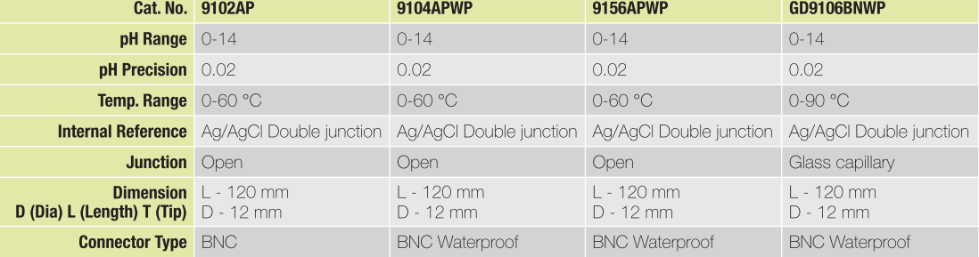 Thermo Scientific Orion 電極系列大致可分為pH、ORP及ATC溫度電極,pH系列又可分為長效型(Sure-Flow)、內建溫度補償型(Triode)、電解液填充型(Refillable)、塑料本體電解液填充型(Epoxy Refillable)、微量量測型(Micro)、半微量量測型(Semi Micro)等,提供實驗室及研究單位使用者更多元的選擇方案