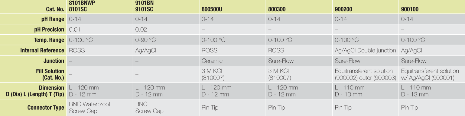 Thermo Scientific Orion 電極系列大致可分為pH、ORP及ATC溫度電極,pH系列又可分為長效型(Sure-Flow)、內建溫度補償型(Triode)、電解液填充型(Refillable)、塑料本體電解液填充型(Epoxy Refillable)、微量量測型(Micro)、半微量量測型(Semi Micro)等,提供實驗室及研究單位使用者更多元的選擇方案