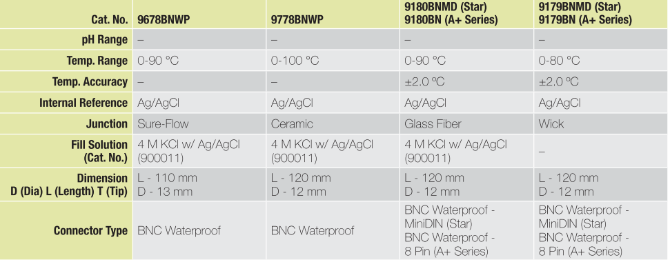 Thermo Scientific Orion 電極系列大致可分為pH、ORP及ATC溫度電極,pH系列又可分為長效型(Sure-Flow)、內建溫度補償型(Triode)、電解液填充型(Refillable)、塑料本體電解液填充型(Epoxy Refillable)、微量量測型(Micro)、半微量量測型(Semi Micro)等,提供實驗室及研究單位使用者更多元的選擇方案