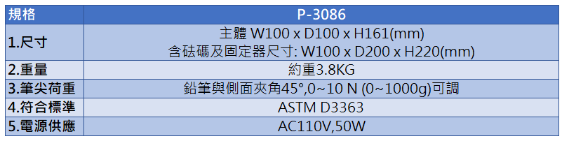 | 3.筆尖荷重 | 鉛筆與側面夾角45°,0~10 N (0~1000g)可調 |
