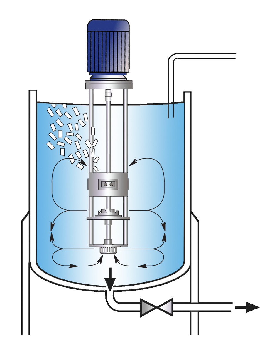 可搭配線上均質機使用,當固體顆粒減小的一定程度時,即可開啟線上型均質機,達到更迅速的溶解與分散均質效果。