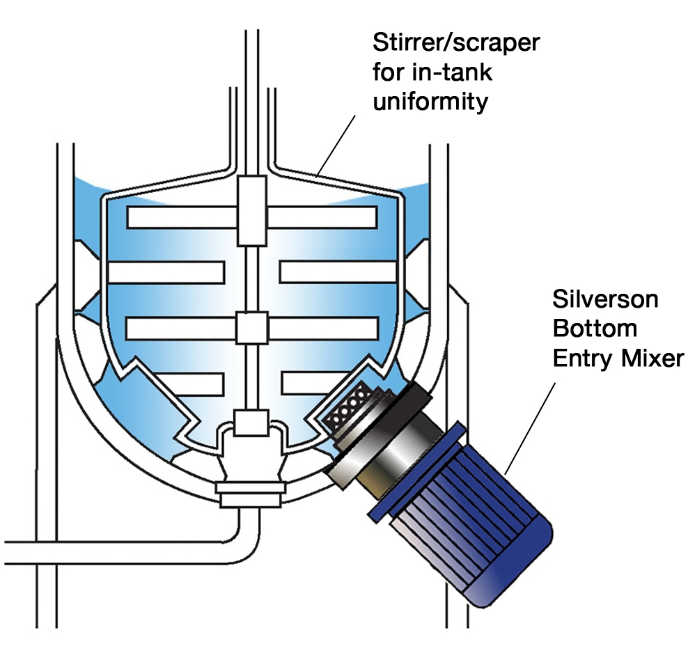 槽底混合均質機是裝設在桶槽的底部或側邊,最常見的用途為搭配錨式或刮刀葉片的慢速攪拌機一併使用,處理高黏度產品。槽底混合均質機能達到產品均質的效果,而透過慢速攪拌機,將均質過的產品在桶槽中做均勻的攪拌,是處理高黏度化妝品、食品、藥品等相關產品的理想選擇