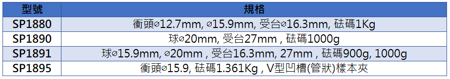 | SP1880 | 衝頭∅12.7mm, ∅15.9mm, 受台∅16.3mm, 砝碼1Kg |