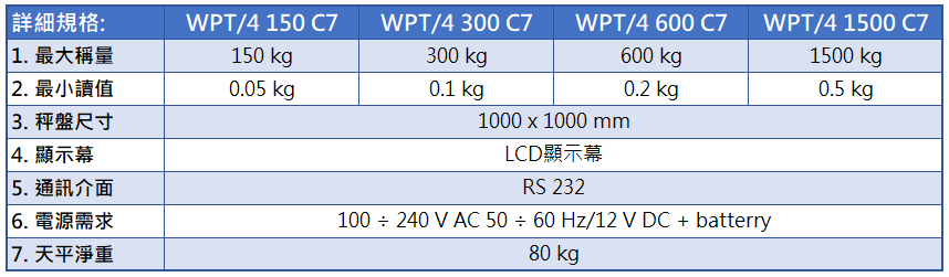 詳細規格 WPT/4 150 C7 WPT/4 300 C7 WPT/4 600 C7 WPT/4 1500 C7