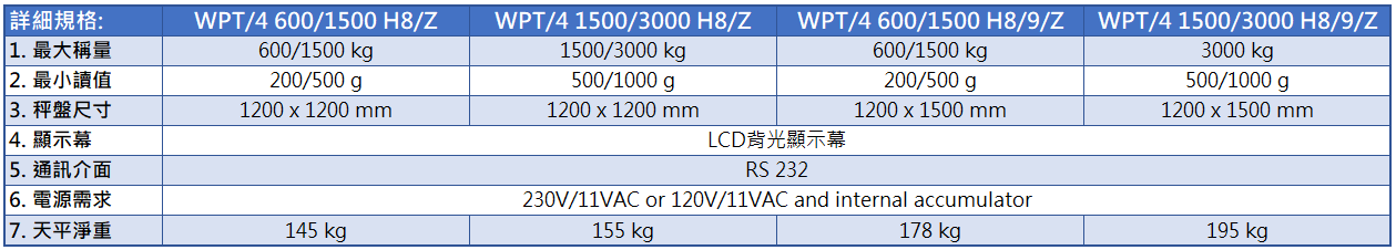 | 3. 秤盤尺寸 | 1200 x 1200 mm | 1200 x 1200 mm | 1200 x 1500 mm | 1200 x 1500 mm |