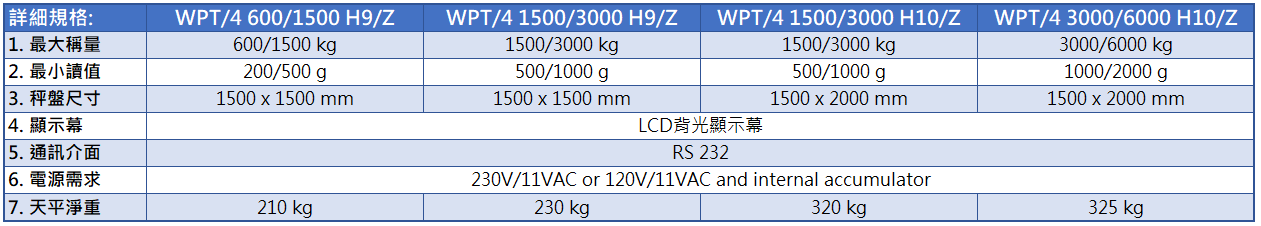 | 1. 最大稱量 | 3000 kg | 1500 kg | 3000 kg | 3000 kg |