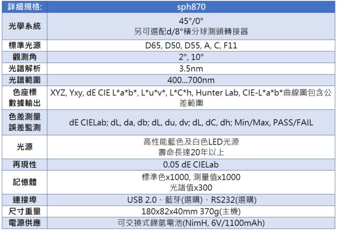 標配45°/0°測頭、另可選配d/8°積分球套件,符合DIN 5033標準規範。適合塑膠、塗料、紙張、紡織品、液體、粉末、顆粒、食品、乳膏、包材、電䌫線... 等。測頭直徑僅25mm、方便對準待測區域,特別是彎曲或小樣物件。全彩高亮度OLED螢幕辨識清晰,可加購ColorDaTra資料分析記錄軟體,同時具備USB 2.0及Bluetooth藍牙無線傳輸機能,另可選配RS232。詳細功能與特色,歡迎向本公司洽詢!