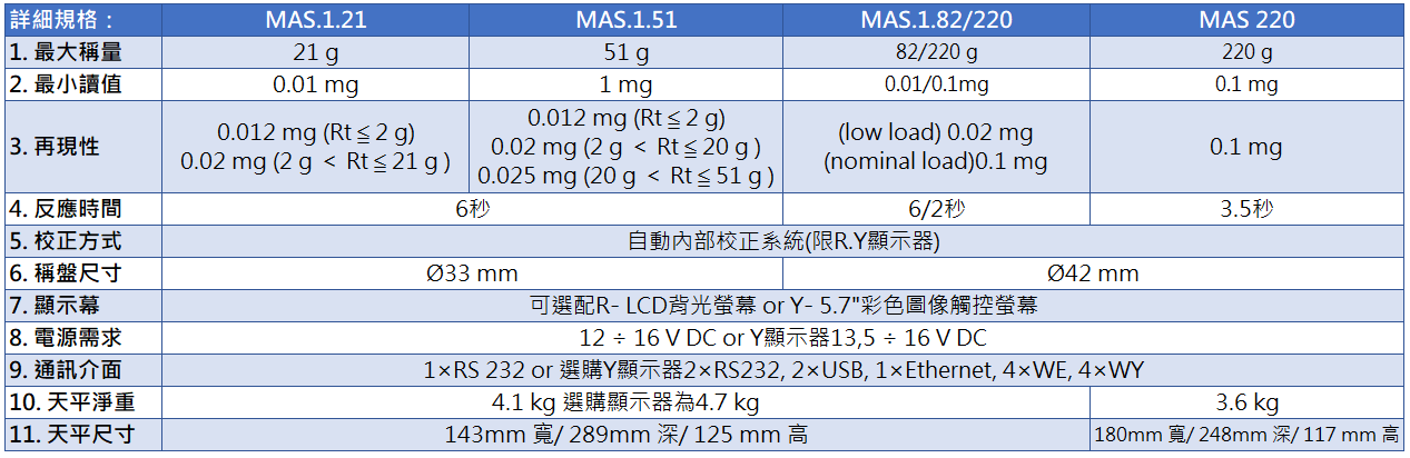 | 2. 最小讀值 | 0.01 mg | 1 mg | 0.01/0.1mg | 0.1 mg |