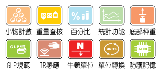 1. 內砝碼校正,可依溫差或時間自動校正;亦可作標準/自定外砝碼校正