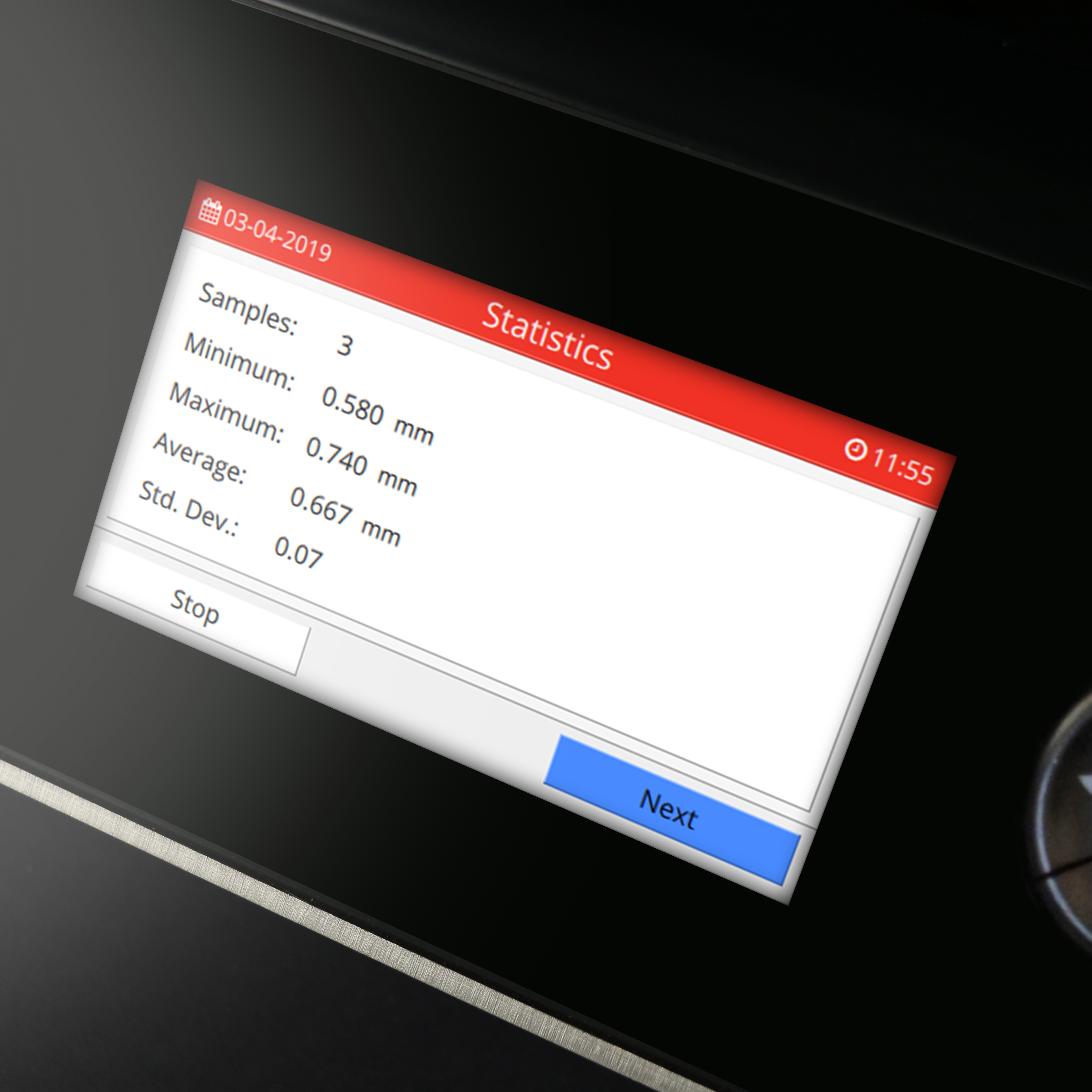 ●採用飛梭旋鈕及液晶背光螢幕,數字顯示杯突深度、解析度 0.01mm;另可定 Pass/Fail 協助判斷是否合乎檢驗標準