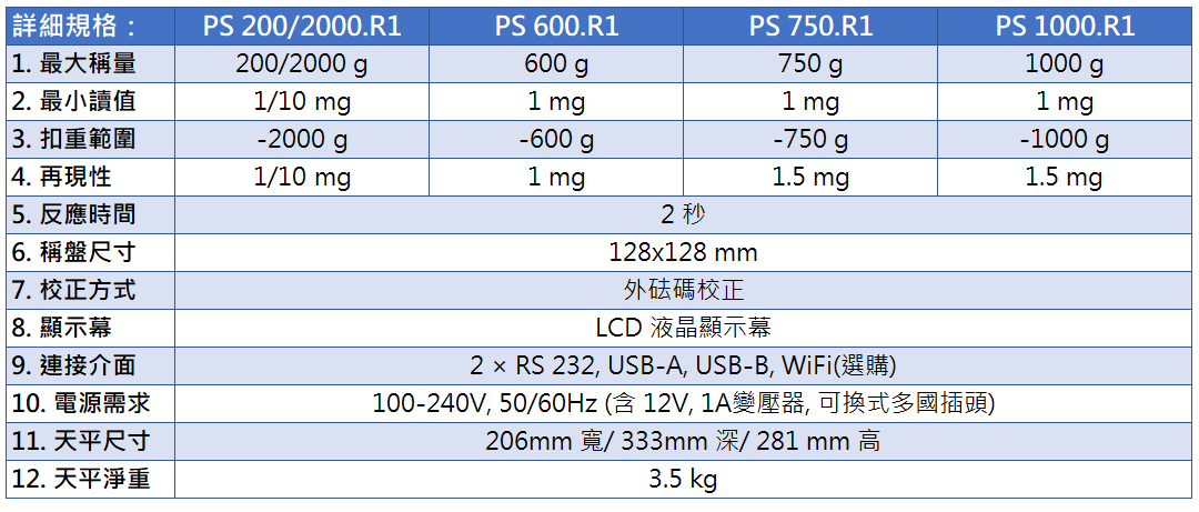 小數下三位數天平(0.001g, 1mg),PS.R1採用外部砝碼校正,提供200g~1000g秤量範圍需求,適合作業現場、品管驗收、各級學校...等使用